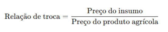 A relação de troca representa quantos produtos agrícolas o produtor precisa vender para comprar uma certa quantidade de insumos (como fertilizantes, defensivos, sementes, etc.).